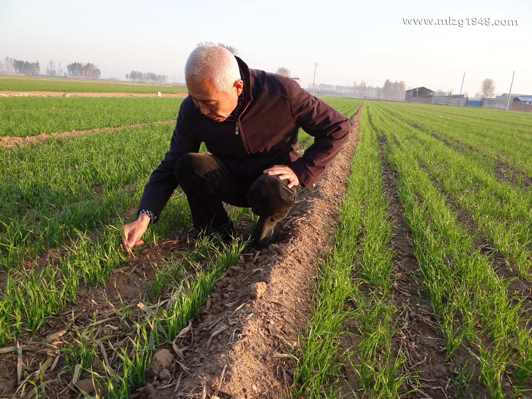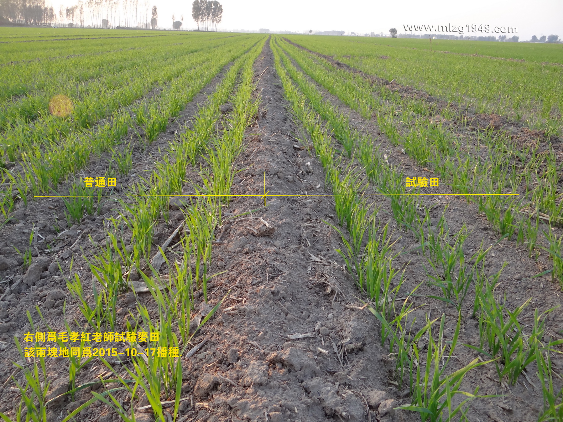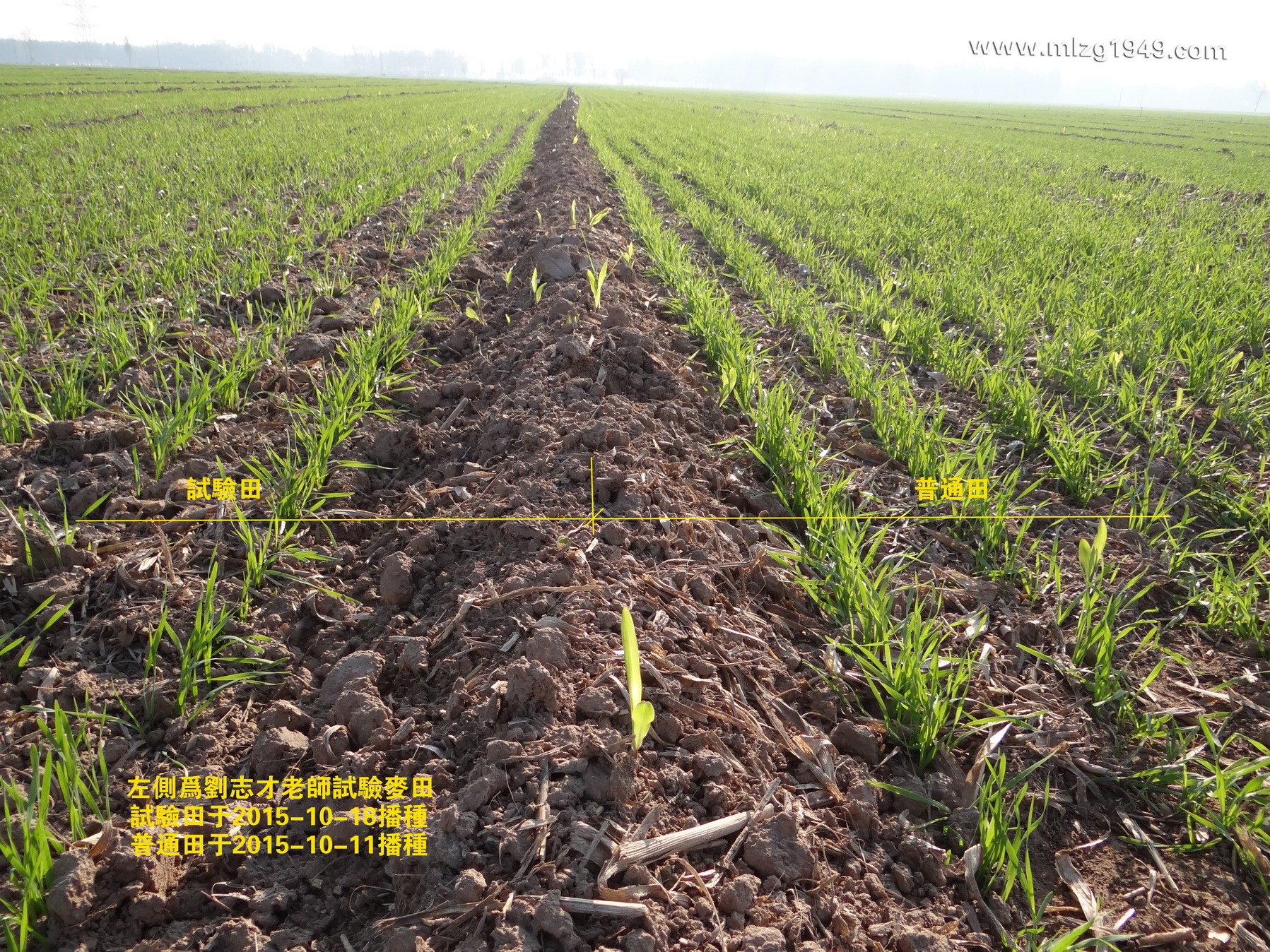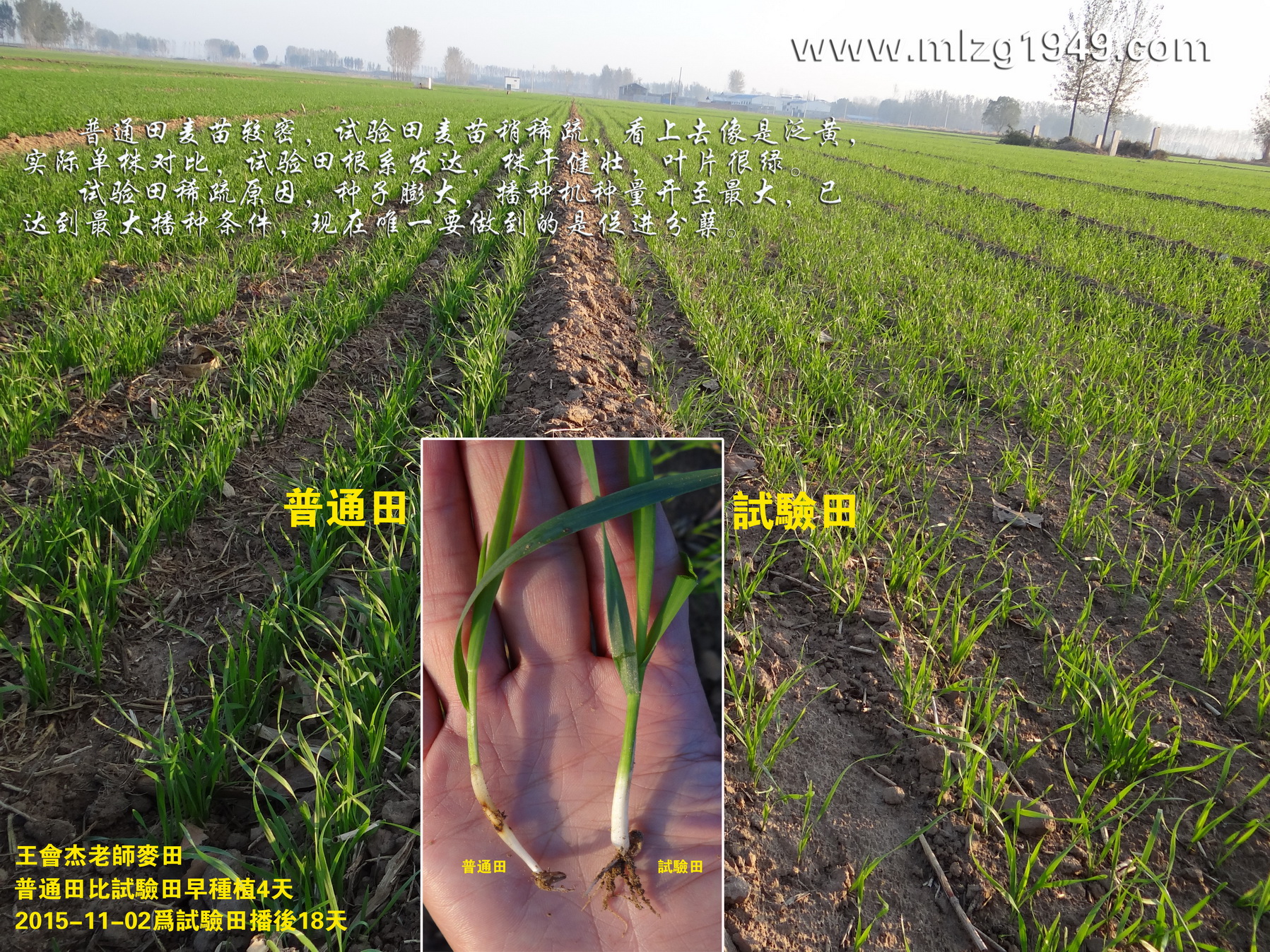 刘志才老师试验田麦苗和普通田对比,稍有稀疏,但不泛黄。