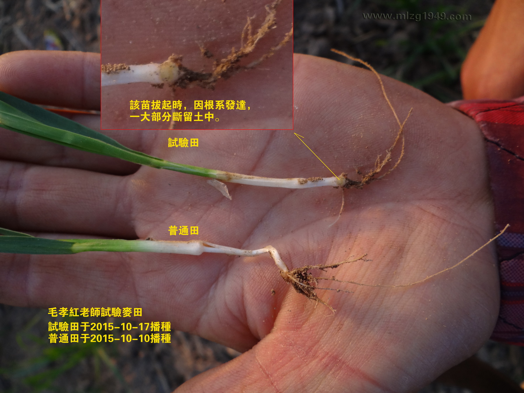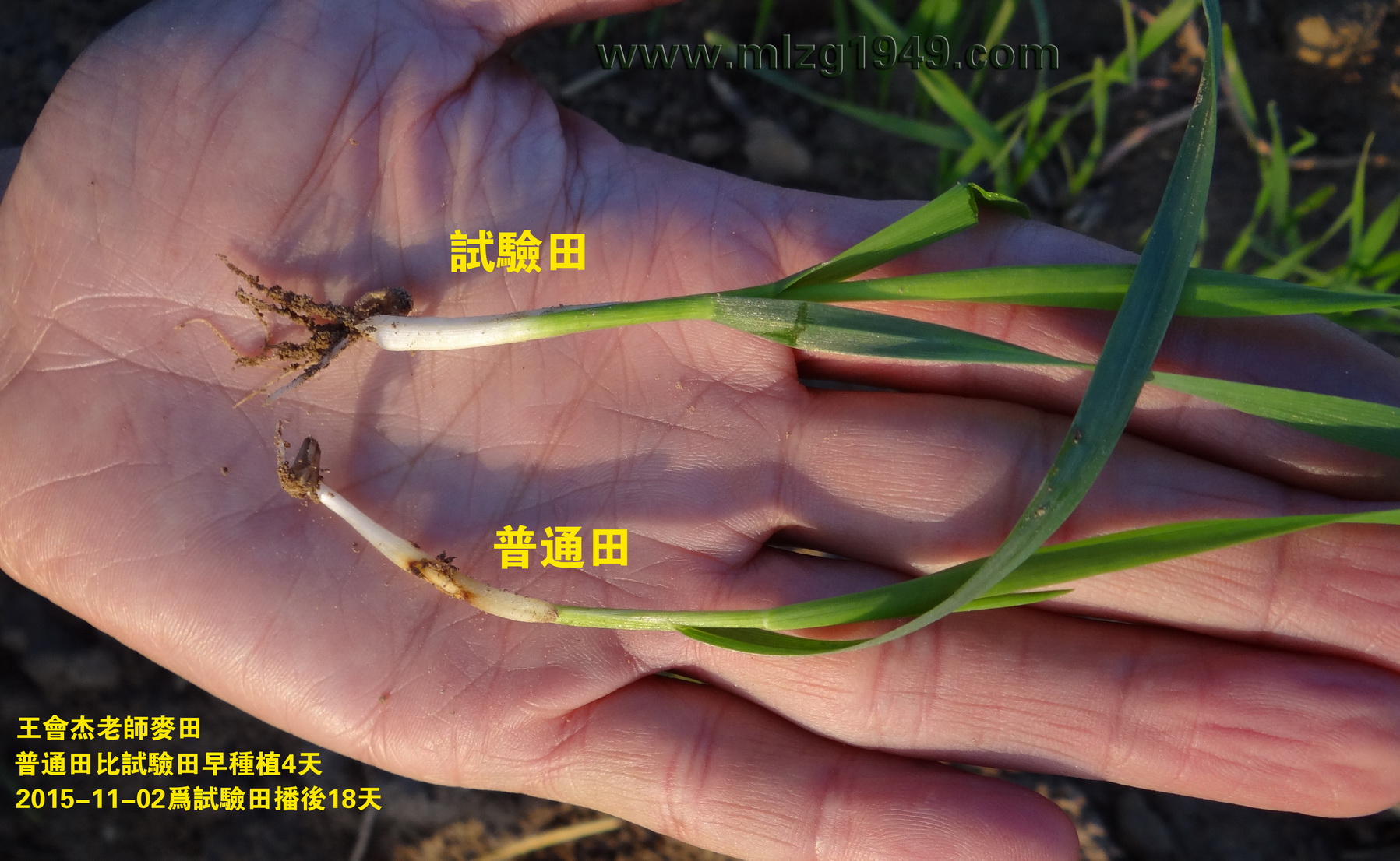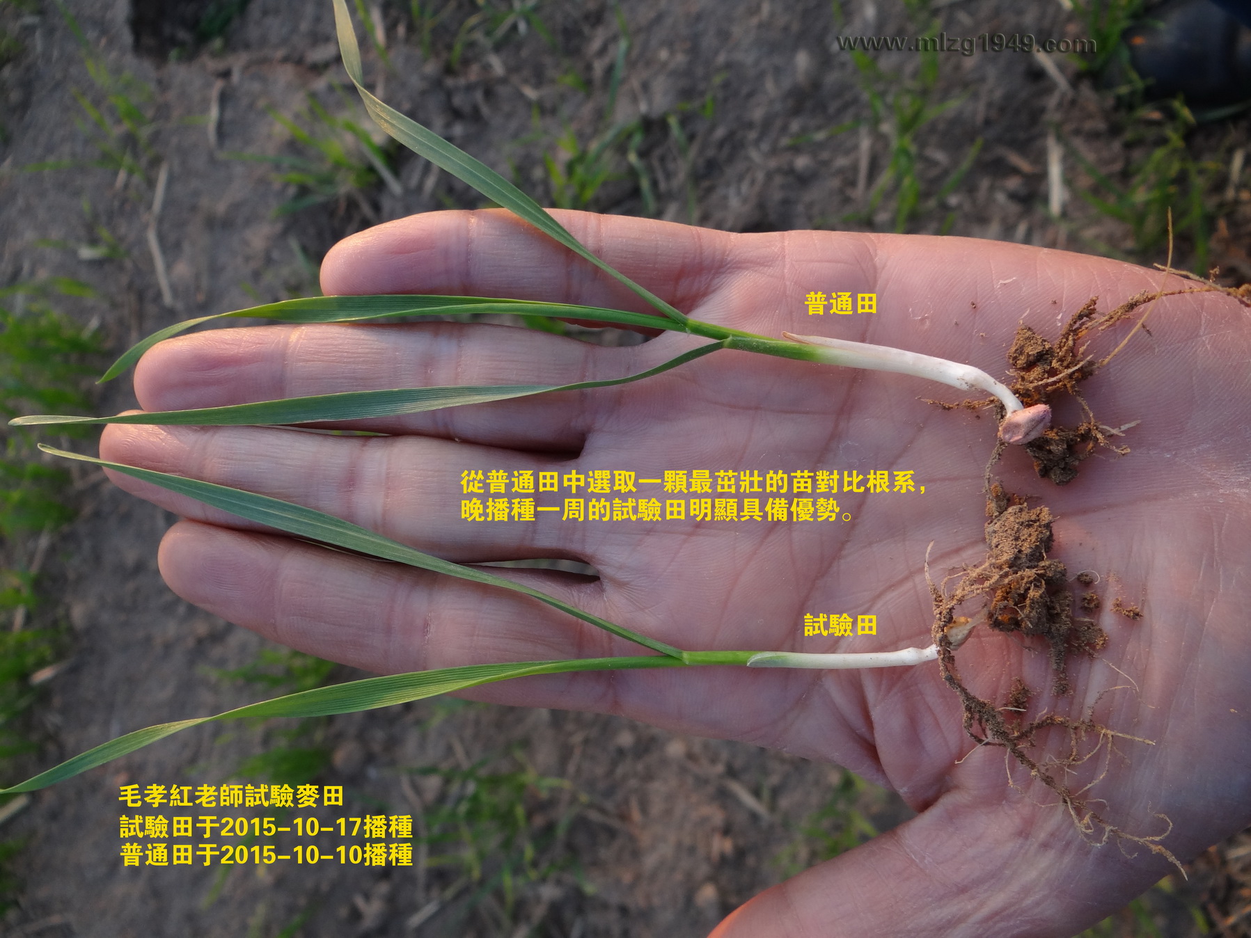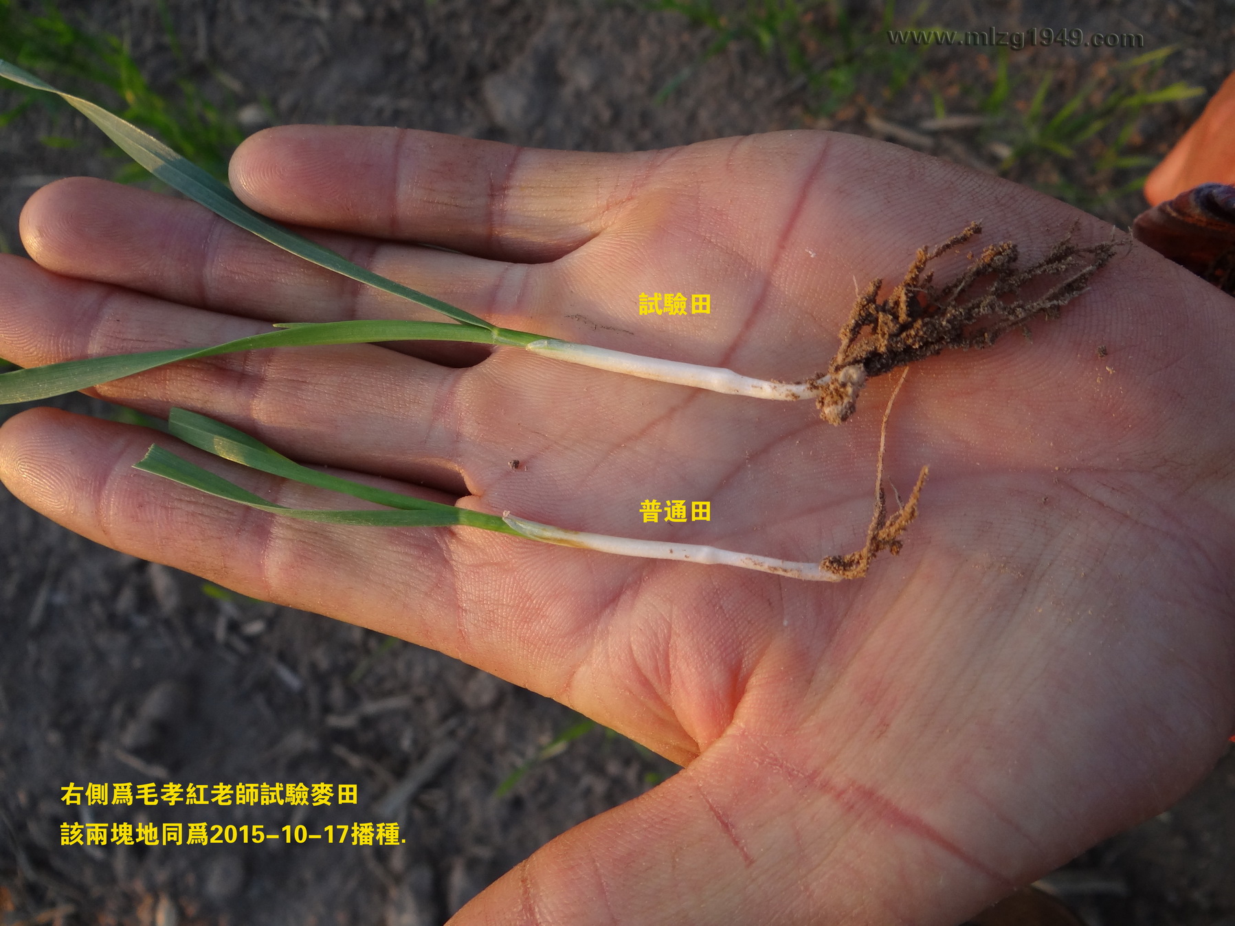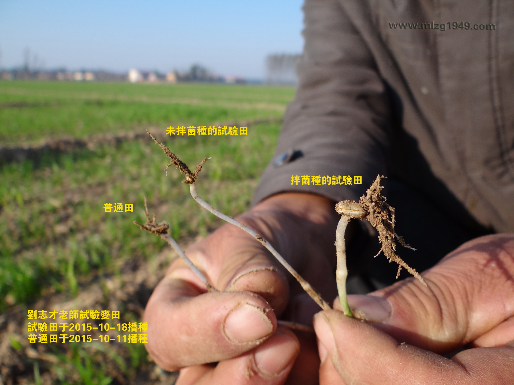 刘志才老师拔出三株麦苗,右手中的一株为普通田麦苗,左手两株为自家试验田麦苗(比较细的一株未拌菌种)。